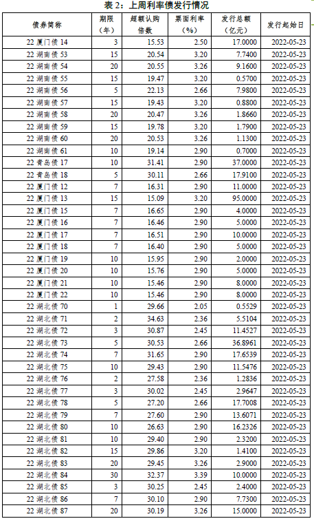 一级市场:上周利率债(含地方债)发行规模小幅上升230.73亿元至5966.43亿元,净融资额则下降160亿元至2977.42亿元。上周地方债的投标情绪较好,部分湖北债、贵州债、江西债、河南债的超额认购倍数均超过30倍;政金债的投标情绪尚可,3Y和7Y国开债超额认购倍数分别达到7.72和6.60,其余期限的政金债超额认购倍数集中在3-5倍之间;国债投标热情较高,3Y国债投标倍数4.97倍,0.25Y国债的投标倍数达到5.16倍。