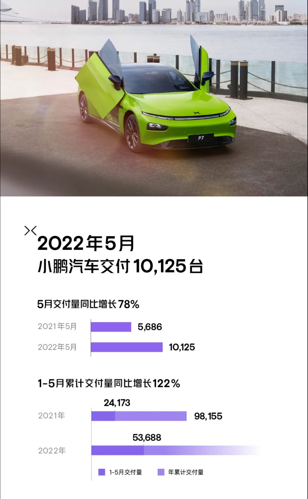 5月,小鹏汽车与哪吒汽车的交付量非常接近,共交付10125辆新车,环比增长12.48%,同比增长8%。其中,小鹏P7交付4224辆,小鹏P5交付3686辆,小鹏G3i交付2215辆。今年1-5月小鹏汽车累计交付53688辆,同比增长122%。