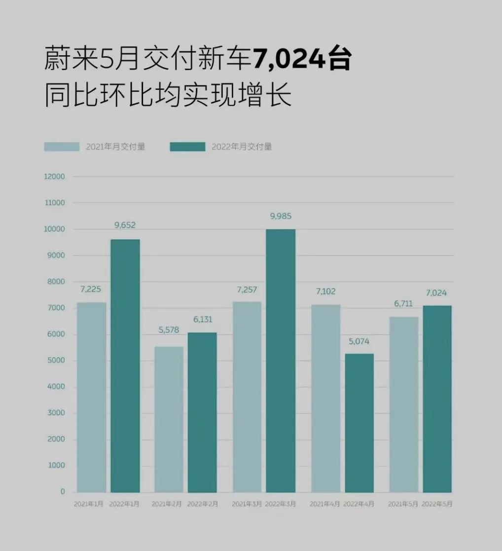 受疫情影响被迫停产的蔚来5月交付量并未过万,但也实现了环比和同比的双增长。数据显示,5月,蔚来交付7024辆新车,环比增长38.43%,同比增长0.47%。截至截至5月31日,蔚来已累计交付新车20.49万辆。