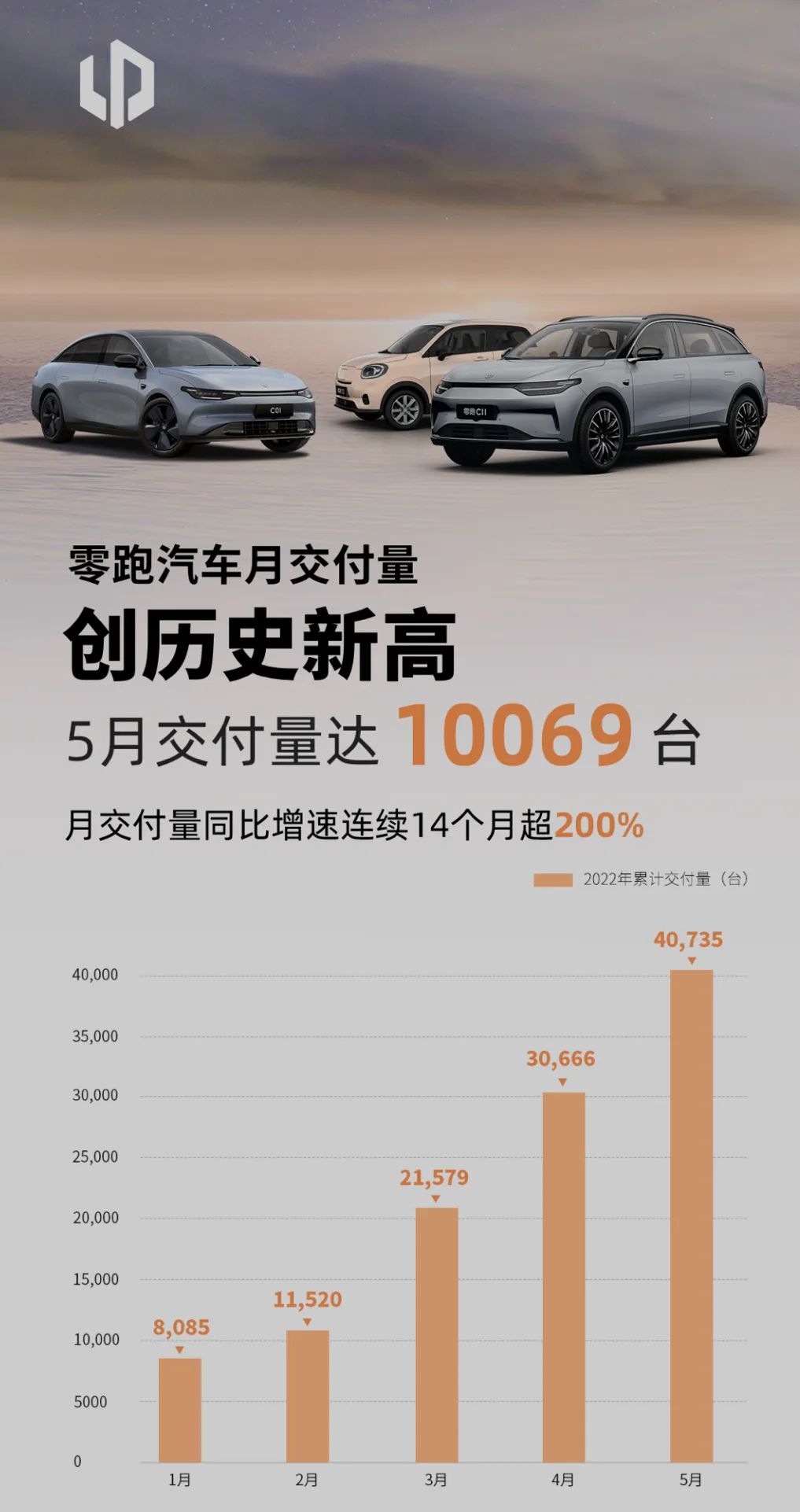 4月实现“大逆袭”的零跑汽车本月交付表现依然抢眼。5月共交付新车10069辆,环比增长10.81%,同比增速连续14个月超过200%。