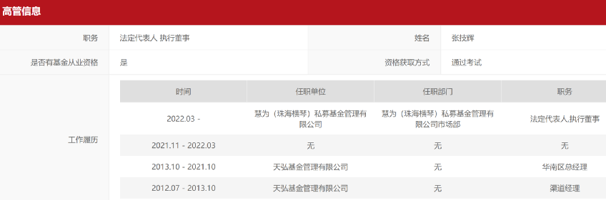 值得注意的是,这家股权私募由几位昔日公募基金公司的高管联手创立。慧为私募基金的法定代表人、执行董事张技辉,2012年7月他就进入公募行业,曾经先后担任天弘基金渠道经理、华南区总经理等职务,直到2021年10月离开天弘。