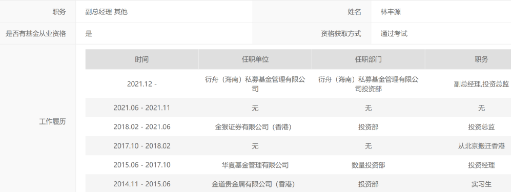 衍舟(海南)私募基金的副总经理、投资总监林丰源,也拥有公募从业经历,2015年6月加入华夏基金,曾经担任数量投资部投资经理;后来他从北京搬到香港,2018年2月担任金猴证券有限公司(香港)投资部投资总监;2021年下半年他开始跟朋友一起创业。