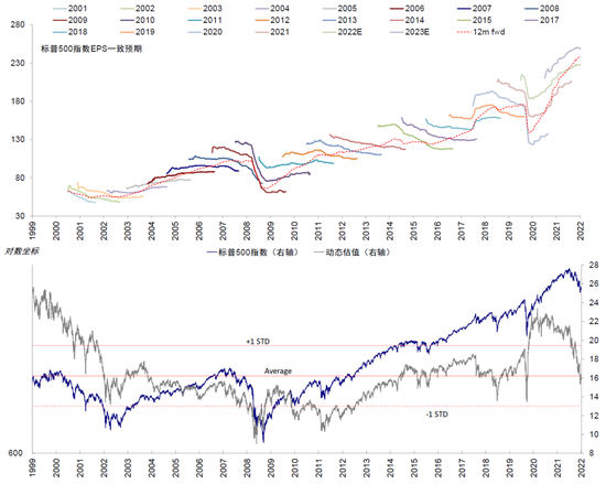 但不管怎样,增长和盈利在未来一段时间内放缓都是大方向,市场对此的关注也因为担心“杀完估值再杀盈利”。美股前期从高点回落首先体现为估值先行(标普500年高点下跌18.2%,动态估值收缩23.8%),当前标普500动态PE已降至16倍左右(处于1990年以来均值附近),但盈利预期还尚未明显下调(2022及2023预期的EPS增速仍维持在9~10%)。