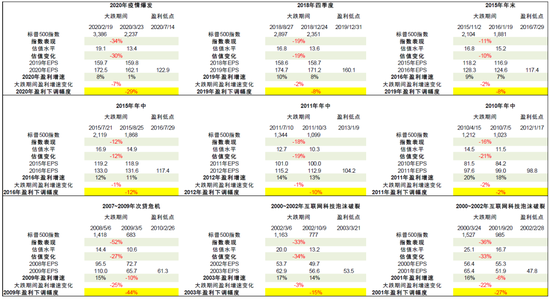 图表:大跌期间,估值往往先行收缩并提前打出未来盈利下调的空间,而市场触底反弹时盈利往往还在下调