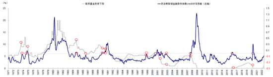 图表:正常情况下,联邦基金利率仅会接近中性利率、金融条件也刚刚破零即可,当前情况都指向衰退风险的增加