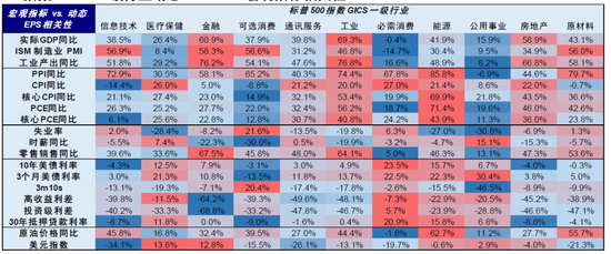 图表:标普500指数GICS一级行业动态EPS vs. 宏观指标相关性