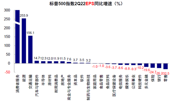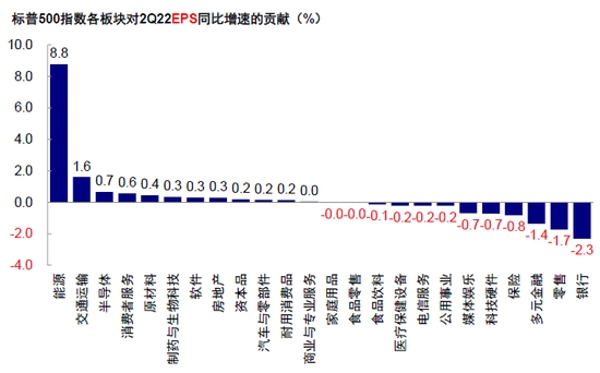 图表:市场预期能源、交通运输、半导体等对标普500二季度EPS增速贡献最多,银行、零售等有所拖累