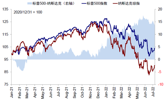近期衰退担忧和交易明显升温,例如上周初10年美债利率自6月中旬的3.5%一度降至本周中的2.8%、原油更是连续大跌突破100美元/桶、美元走强突破107创20年新高、黄金因此跌破1740美元/盎司;纳斯达克为代表的美股成长风格反而因此受益,明显反弹。