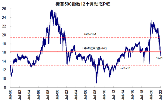 图表:当前标普500指数动态估值已回落至16.3倍左右(基本位于1990年以来均值水平)