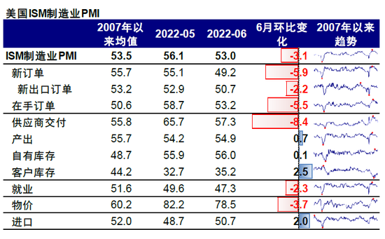 图表:美国6月ISM制造业PMI快速回落至53.0(vs. 5月56.1)