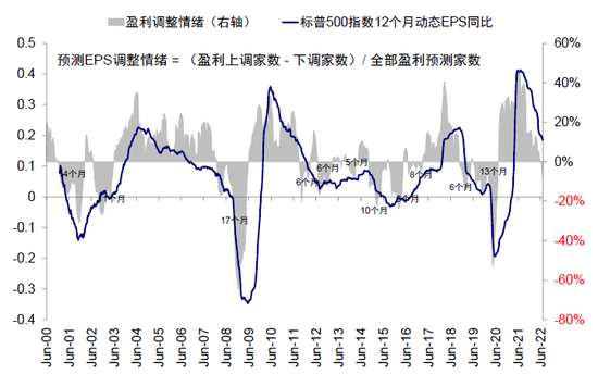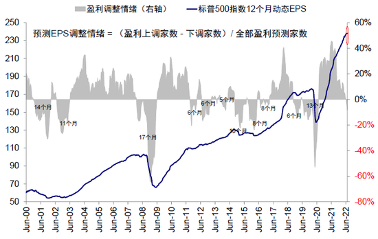 时间维度:盈利放缓通常持续3~4个季度。回顾过去20年的经验,我们发现盈利增速下滑平均持续3~4个季度,如2020和2017年(2个季度)、2014~2016年(6个季度)、2010年(3个季度)、2007年(4个季度)、2005~2006年(5个季度)。反观此轮,剔除掉疫情对基数的较大扰动(2021年二季度高基数),美股盈利增速的明确放缓是从今年一季度和二季度开始,因此这一趋势在未来一段时间仍将延续,直到新的增长点或货币政策出现拐点提供对冲。与此同时,更为高频和敏感的盈利调整情绪也逐渐转负,调整情绪的下修对应动态EPS增速的拐点,而调整情绪的转负则基本对应动态EPS绝对水平的下修。从历史经验看,调整情绪转负一般持续2~3个季度,当前已经降至-8.2%。