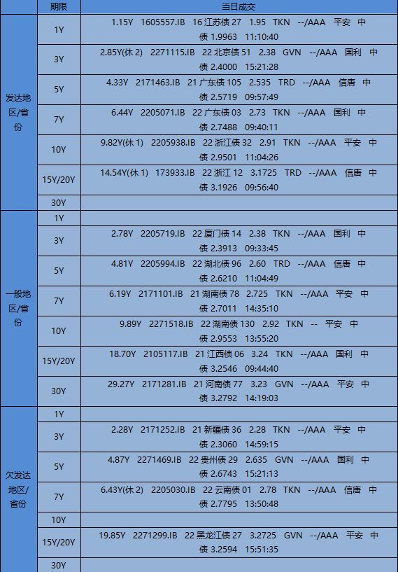 一级市场(今日结果)(一级组)【8月16日利率债结果】【国开结果】1Y 220211X3 加权利率 1.5555% 边际利率 --% 全场倍数 3.97倍 边际倍数 1.58倍 3Y 220202X18 加权利率 2.1573% 边际利率 --% 全场倍数 6.41倍 边际倍数 80.67倍 5Y 220208X9 加权利率 2.3664% 边际利率 --% 全场倍数 4.44倍 边际倍数 1.13倍 7Y 220204X23 加权利率 2.7366% 边际利率 --% 全场倍数 5.88倍 边际倍数 9.44倍今日国开市场需求不错。1Y考虑返费后结果为1.6517,低于二级9.8BP发出。3Y考虑返费后结果为2.2265,低于二级3.8BP发出。5Y考虑返费后结果为2.4245,低于二级5.5BP发出。7Y考虑返费后结果为2.7745,低于二级1.5BP发出。 【农发结果】2Y 092218003Z08 加权利率 2.0858% 边际利率 --% 全场倍数 4.54倍 边际倍数 5.5倍 7Y 092218004Z01 加权利率 2.7652% 边际利率 --% 全场倍数 4.28倍 边际倍数 6.6倍今日农发市场需求不错。2Y考虑返费后结果为2.1360,低于二级4.4BP发出。7Y考虑返费后结果为2.7956,低于二级1.4BP发出。【地方债结果】2271607,22内蒙古债27,再融资,普通专项,5Y,50.2492亿,2.67,(20bp),全场25.21,边际21.462271606,22内蒙古债26,再融资,一般债,5Y,17.5408亿,2.67,(20bp),全场23.84,边际21.74801015,22天津79,再融资,普通专项,5Y,145.5493亿,2.62,(15bp),全场16.18,边际4.05801014,22天津78,再融资,一般债,5Y,28.56亿,2.62,(15bp),全场17.38,边际22.14801013,22天津77,新增,轨交专项,30Y(25.5178),1.2亿,3.33,(10bp),全场21.67,边际16.92801012,22天津76,新增,其他专项,30Y(20.5144),0.3亿,3.33,(10bp),全场20.67,边际14.33801011,22天津75,新增,水务专项,30Y(18.0127),5.21亿,3.33,(10bp),全场24.09,边际20801010,22天津74,新增,其他专项,20Y(12.5089),0.6亿,3.16,(10bp),全场17.17,边际2.17801009,22天津73,新增,其他专项,10Y(8.006),1.2亿,2.87,(15bp),全场16.92,边际1.67801008,22天津72,新增,市政基建专项,10Y,10亿,2.87,(15bp),全场18.02,边际2.1801007,22天津71,新增,市政基建专项,7Y,2.5亿,2.79,(10bp),全场17.32,边际3.48
